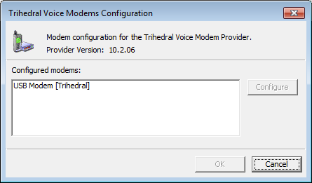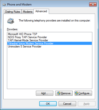- Verify that the Trihedral® Voice Modem Service Provider is listed as shown here. Note: If not, your VTScada modem drivers have not been installed correctly. Contact Trihedral Technical Support (1-800-463-2783) for assistance.