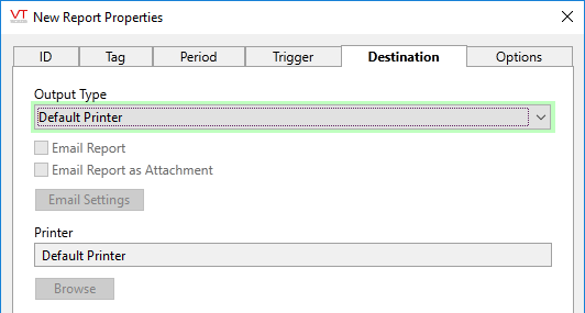 Select a trigger that will generate the report. A variety of timing options are available, or you can link to any tag that will change in value from zero to non-zero as the trigger. (For example, an Alarm tag or a Trigger tag.)