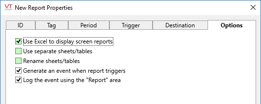The Generate an event option must also be selected. Causes the event to be associated with the system area, "Report". Otherwise, the event will be associated with the report tag's area.