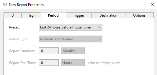 Use the Period tab of the Report Tag properties folder to select a preset time period or configure a custom time period for the report to be generated by this tag. Note that the Report Button widget