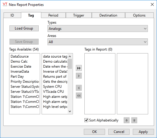 The Save Group button enables you to save the tags that have been configured for this report as a group that can later be reused for report generation. Step-by-step instructions can be found in Saving and Loading Tag Groups for Reports.