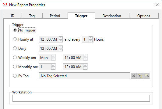 The Trigger Tag field enables you to select any tag with a numeric value whose value will be used to generate this report (when the value of the selected tag changes, the report will be generated). The Trigger Tag field only becomes enabled when the By Tag radio button is selected.