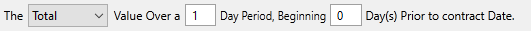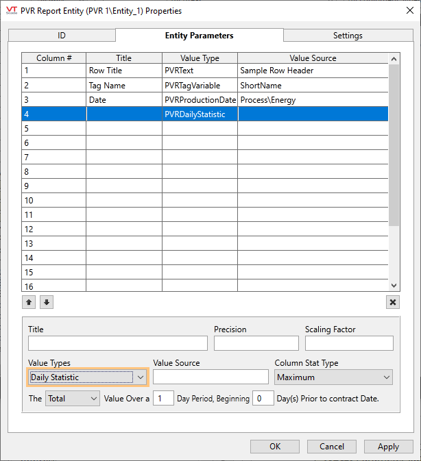 The Value Types: Contract Hour Data, Data Without TimeStamp, Contract Hour Data (Lag), Data Without TimeStamp, and Daily Statistic, provide a means of creating single- or multi-day summaries (shown below). The number of days and offset from production date can be specified, as well as the type of statistic (total, average, maximum, minimum) to apply to the data set.