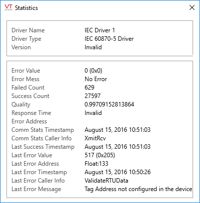 The Show Stats button will display the following information about a IEC 60870-5-104 driver tag.