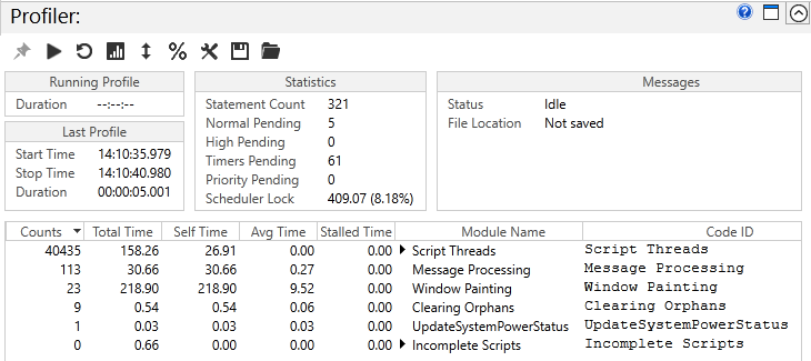 An example of the Profiler follows. Note the "Settings" button. This will open a configuration dialog that can adjust how the profiler works. The notes in the Profiler Settings topic contain important information for anyone who intends to save the data collected by the profiler.