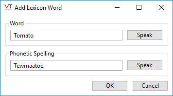 Use the Speech Lexicon dialog to adjust how words are pronounced when spoken by voice engine. If using a third party speech engine that provides its own lexicon configuration, disable the VTScada Speech Lexicon by changing the value of the property, EnableLexiconDialog to 0.