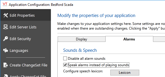 The Speech Lexicon is opened from the Alarms tab of the Edit Properties window: