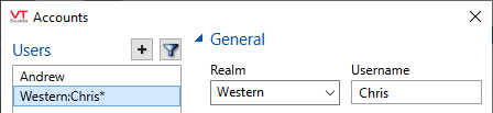 A realm user is one who is associated with a specific security realm. The Realm option is available only after completing the steps described earlier in this topic. (See NameSpaceDelimiter Property above). Realm names are stored as part of the user name, separated by the NameSpaceDelimiter character. (For example, Western:Chris)