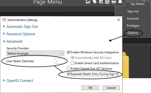 The realm delimiter must be a symbol (neither a letter or a number). While several symbols will work, you are advised to use a colon, which will serve reliably in all situations. You must define the realm delimiter before you can select the option of using separate realm-entry during sign in. Remember that it is necessary to press tab or enter after typing in a VTScada text field.
