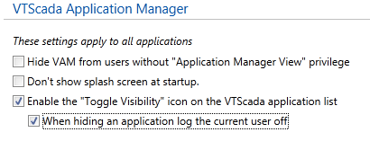 The option to log the current user off automatically is selected by default, and is recommended for most situations. If not selected, then the current user will remain logged on until the automatic logoff time is reached. Until then, anyone may click the application's Show button in the VAM and operate the application as the logged on user.