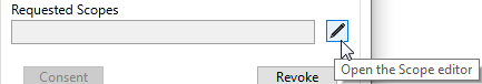 This must be an email account registered with your provider. - Select the pen beside the Requested (Grant) Scopes field to open the Grant Scopes editor.