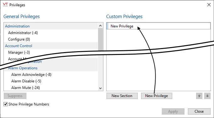 Users with the Administrator privilege can create custom privileges within the Privileges dialog. You can also use this dialog to suppress general privileges so that they cannot be seen in the Accounts dialog, thus preventing anyone (including yourself) from granting that privilege to an account or role while it is suppressed.