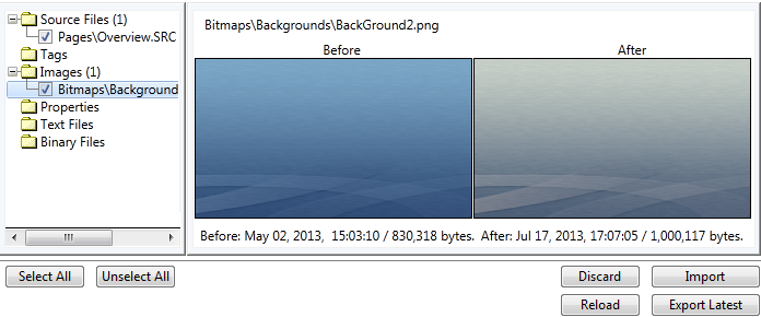 For source code and text files, you may review the changes, line by line before importing them. The new version of the line (in the file being imported) is marked in green and the old version (the current version in change control) is marked in yellow.