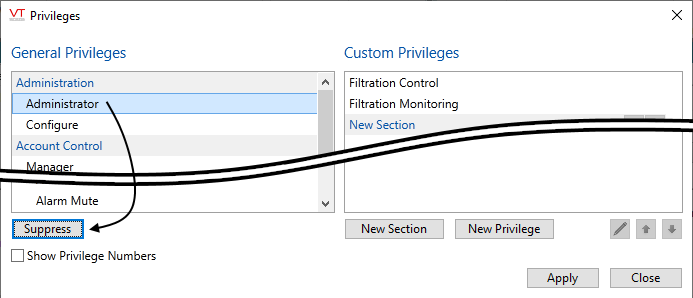 - Select the privilege you wish to suppress in the list of General Privileges.