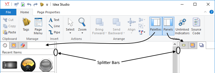 Divide the palette (on the left) and the panels (on the right) from the drawing area of the Idea Studio.