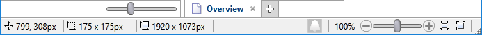 Display controls are provided in the bottom bar of the Idea Studio. You can change the display scale to 'zoom-in', the better to see detail in your work. You can also change the display scale of the palettes to see which tool you are choosing or to see more tools at a smaller scale. The three sets of coordinates in this toolbar show the top-left corner location of selected objects, the overall size of the selection and size of the page.