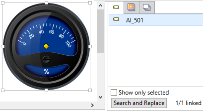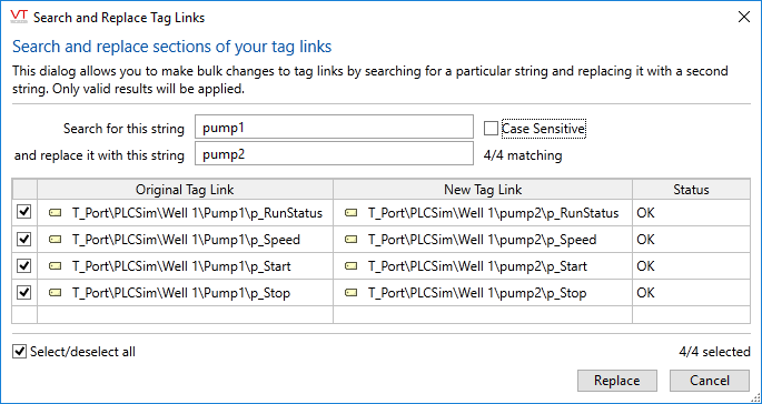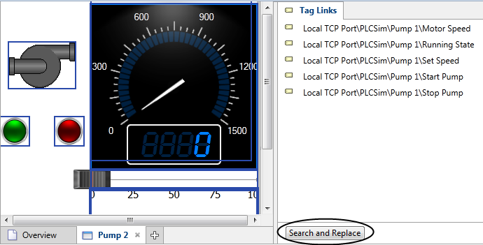 All links that have "Pump 1" anywhere in the link are selected. The preview operates immediately, replacing "Pump 1" with an empty string in every link. The status will change to "Bad tag reference." Nothing will happen to the widgets until you click Replace at the bottom right of the dialog. - Type "Pump 2" in the second field, then press tab or enter.