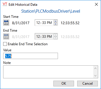 If the value at a selected timestamp exists only because it was entered manually using the Edit Historical Data dialog, then there is no logged VTScada value to which it can revert. In this case, the most recent value (logged or overridden) prior to the selected timestamp will be assigned. The manually-entered row cannot be deleted.