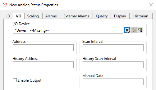 The I/O Tab includes properties used to identify and establish a connection to the communication driver tag being used to exchange data with your physical I/O device (e.g. PLC or RTU), or to the polling driver responsible for determining the order and rate at which data polls will occur.