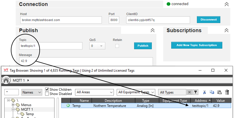 VTScada does not support the use of wildcards. - TopicName is required and is a unique name describing the information. Examples include:
