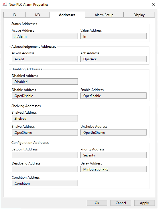 PLC Alarm Properties Addresses tab