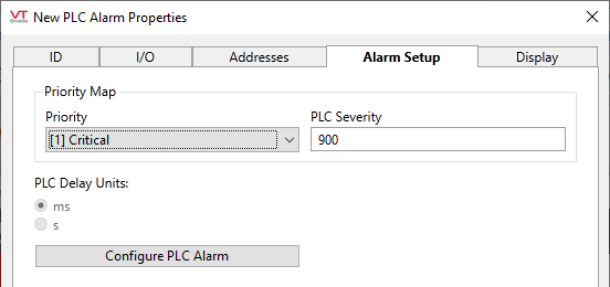 The internal units of a custom PLC may be in seconds or milliseconds, while the delay of the PLC alarm tag is written and displayed in seconds. This configuration allows proper configuration (and therefore display in VTScada) of the delay from the PLC.
