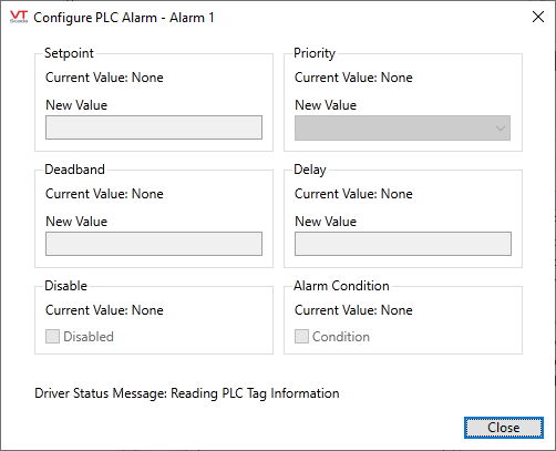 Some users may want to issue configuration controls to the PLC via VTScada rather than use third-party software to do their PLC alarm configuration. The PLC alarm tag is able to configure Setpoint, Priority, Deadband, Delay and Disabled status. The PLC alarm tag has a custom widget for reading these configuration values as a reference, and outputting user-defined values to the correct address in the PLC.