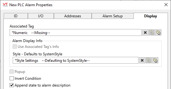 PLC Alarm properties Display tab