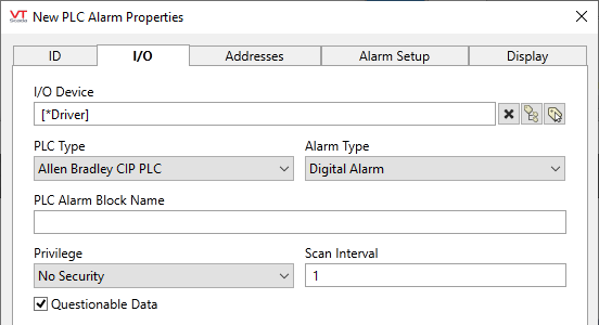 The I/O Tab includes properties used to identify and establish a connection to the communication driver tag being used to exchange data with your physical I/O device (e.g. PLC or RTU), or to the polling driver responsible for determining the order and rate at which data polls will occur.