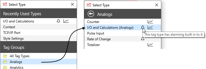 (*) If you had set the Tag Browser's type filter to a specific tag type, then the selection part is done. When you add a new tag, the properties dialog will open for a new instance of the type that matches the filter. If the filter is set to a group, then the Select type dialog opens to that group.
