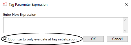 When using an expression to configure a parameter value, you can choose whether the value should be evaluated only when the tag starts (and re-starts), or whenever there is a change to any value used by the expression. Non-optimized tag expressions are intended for situations where configuration values must be obtained from equipment, which is reachable only after the application starts.