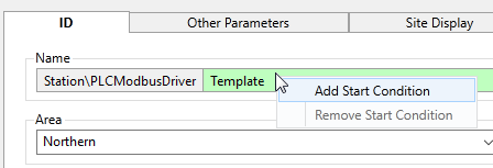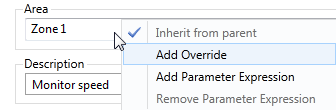 For all of the above, right-click on the parameter in the tag's configuration dialog. Your choices will vary depending on whether you add the expression to the name parameter (start conditions only), area parameter (which can inherit from its parent), and whether the tag is part of a user-defined type (where changes are considered overrides).