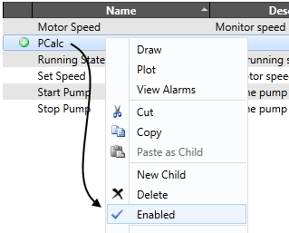 Tags can be disabled automatically by use of a Start Tag Expression in the Name field. This is often used when building tag structures automatically. For example, you might create a lift station or well that can have one to four pumps. The tags for Pump 2, Pump 3 and Pump 4 would be configured so that they will be disabled in stations where they are not required. See: Design Your Own Tags