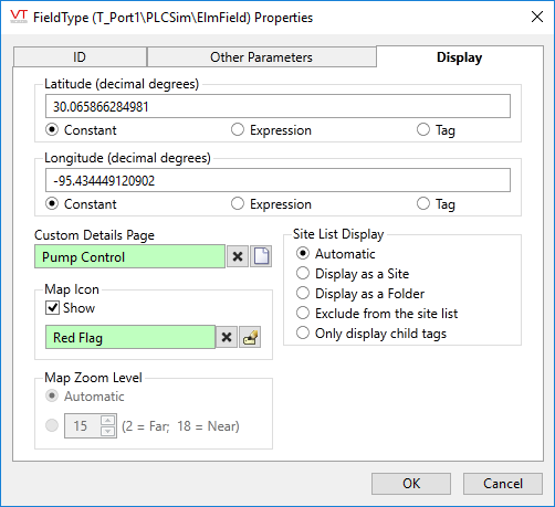 Each icon is a Tag Widget that you create. To function as a map icon, various parameters will need to be set and mapping-related VTScada widgets will need to be included. A pulse beacon will be added automatically for you. When an operator clicks your icon, it will open a site page (or your custom page). You do not need to add a hotbox.
