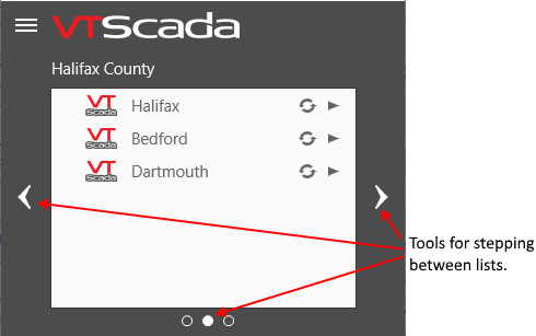 For example, the following figure shows a detail from a VAM that has three lists. (Note the three dots at the bottom of the figure.) Of those three, the list for Halifax County is shown. You can navigate between the lists using either the arrows on either side, or the dots at the bottom of the list. The filled dot in the center indicates that this is the second of three lists.