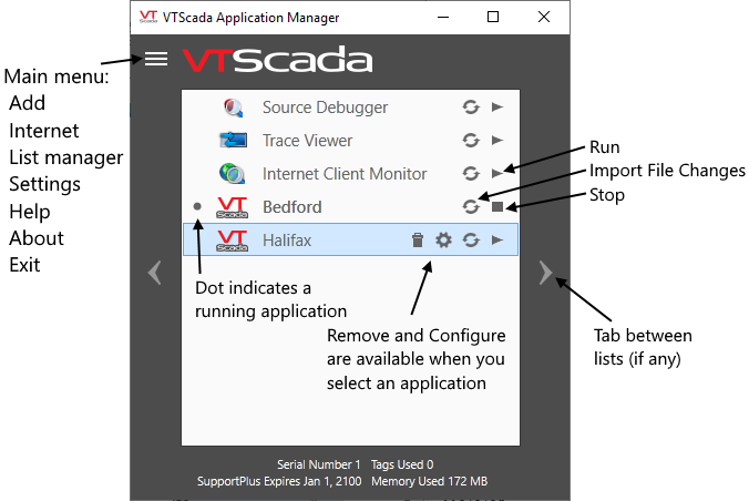Use the VTScada Application Manager (VAM) to create and manage applications. It will open whenever you start VTScada, and also at the end of the installation process. As a security precaution, you can configure the VAM to hide from all but authorized users while your application runs.