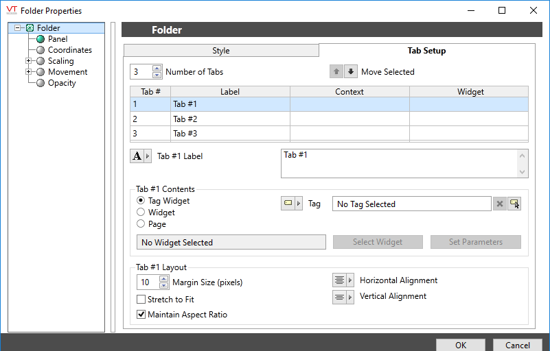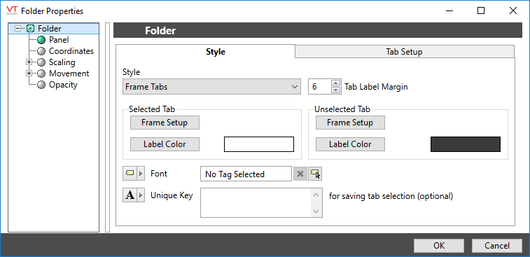 The number of tabs, the label for each, and the content of each tab's frame are defined with the Tab Setup.