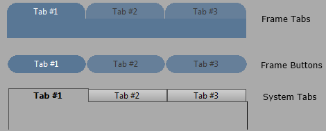 The shape of the tabs themselves and the area below the selected tab are controlled by the Frame Setup selection. If either Frame Tabs or Frame Buttons are selected for the overall style, then you may further refine the shape by selecting one of the six built-in frame designs. See Frame for details. The System Tabs style does not allow for further refinement of the frame.