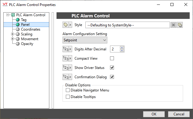 Note that the properties dialog of the PLC Alarm tag, Configuration tab, a link to a dialog containing several of these widgets. Configuration can be done either using the dialog available from within the PLC Alarm tag, or this widget can be drawn on a page, allowing operators to update any of the available properties.