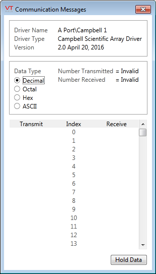 The Hold Data button will freeze the display. Otherwise the dialog updates continuously as messages are transmitted.