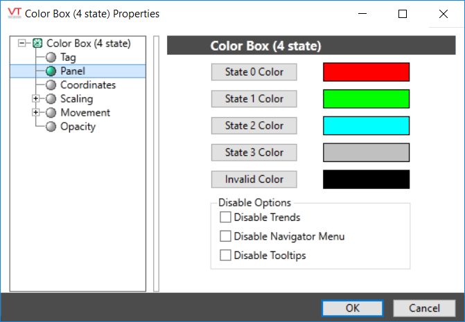 The Color Box widget is used to represent the associated tag as a box that changes color based on the tag's value. It is primarily used with that have discrete states such as digitals and alarms, but may also be used with analogs. For an analog tag, the value will be rounded to find the closest match to one of the states.