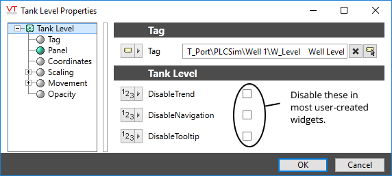 Every new widget, both plain and tag, will have its own parameters for operator interaction. If you want to operate a control within the widget without having the Trend window for the widget in general opening, you are advised to open the new widget's properties dialog and select Disable Trend. Most developers will also disable navigation and tooltips for the widget itself, allowing operator controls for the component widgets to be used instead.