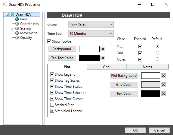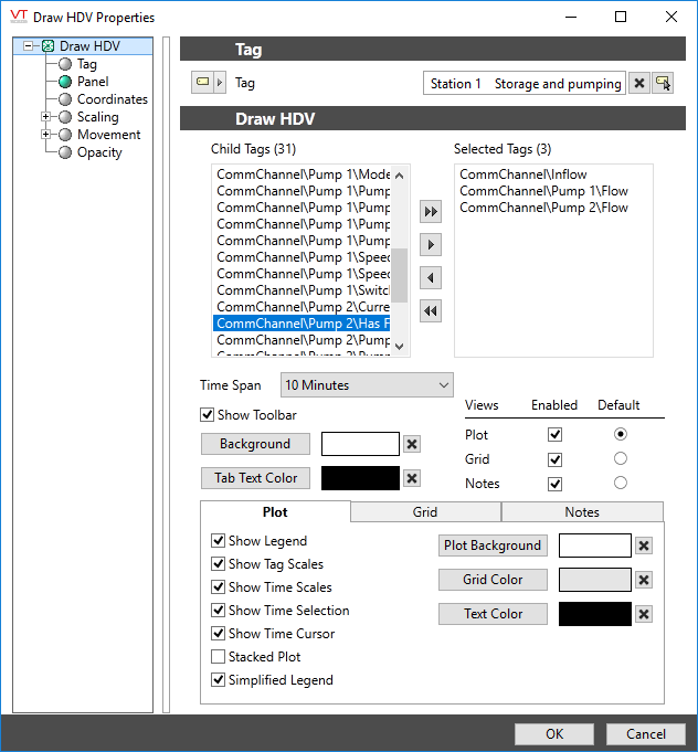 If linking to a parent tag (Context or user-created type), use the widget's properties dialog to select the child tags that should be included in the plot. You can also configure the appearance of the HDV, including title bar, time selector (footer bar), colors and more. A useful technique is to add the DrawHDV widget to a parameterized page, linking the widget to a page parameter of type, tag. Menu entries or page hotboxes are then configured to use different instances of the user-created tag type when opening the page.