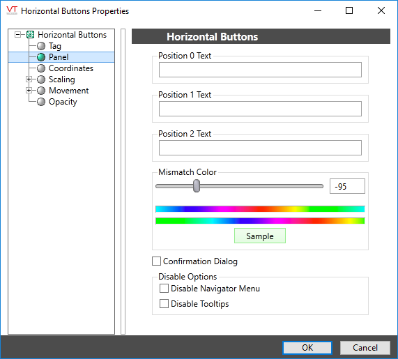 Set the labels that will appear on the buttons. The buttons are drawn from left to right and match the Position 0 through Position 2 settings of the associated selector switch.