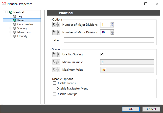 The Nautical Gauge widget represents the associated tag's value as a photorealistic meter, displaying both labeled major divisions and unlabeled minor divisions, the dial of which fluctuates according to the tag's value.
