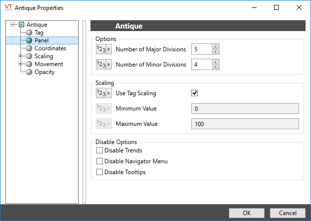 You can override those values to set your own scale range. For example, assume that you have a tag for which the minimum and maximum scaled process values are 20 and 80 respectively. Drawing this tag with a minimum value of 0 and a maximum value of 100 will result in a meter that shows a full range of numbers from 0 to 100, but whose needle will move only between 20 and 80.
