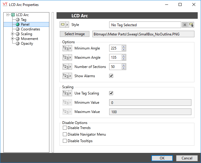 You can override those values to set your own scale range. For example, assume that you have a tag for which the minimum and maximum scaled process values are 20 and 80 respectively. Drawing this tag with a minimum value of 0 and a maximum value of 100 will result in a meter that shows a full range of numbers from 0 to 100, but whose needle will move only between 20 and 80.