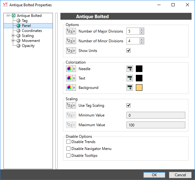 Otherwise, you can override those values to set your own scale range. For example, assume that you have a tag for which the minimum and maximum scaled process values are 20 and 80 respectively. Drawing this tag with a minimum value of 0 and a maximum value of 100 will result in a meter that shows a full range of numbers from 0 to 100, but whose needle will move only between 20 and 80.