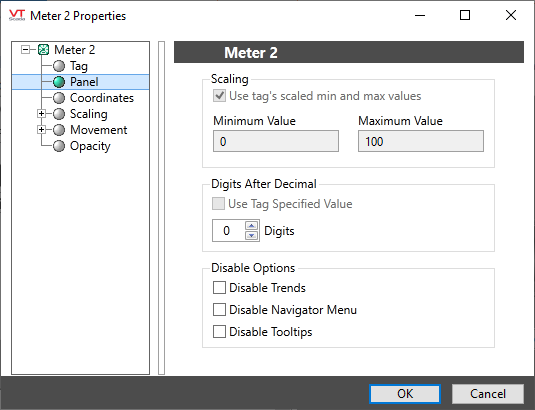 You can override those values to set your own scale range. For example, assume that you have a tag for which the minimum and maximum scaled process values are 20 and 80 respectively. Drawing this tag as a meter 2 with a low scale range of 0 and a high scale range of 100 will result in a meter that shows a full range of numbers from 0 to 100, but whose needle will move only between 20 and 80.