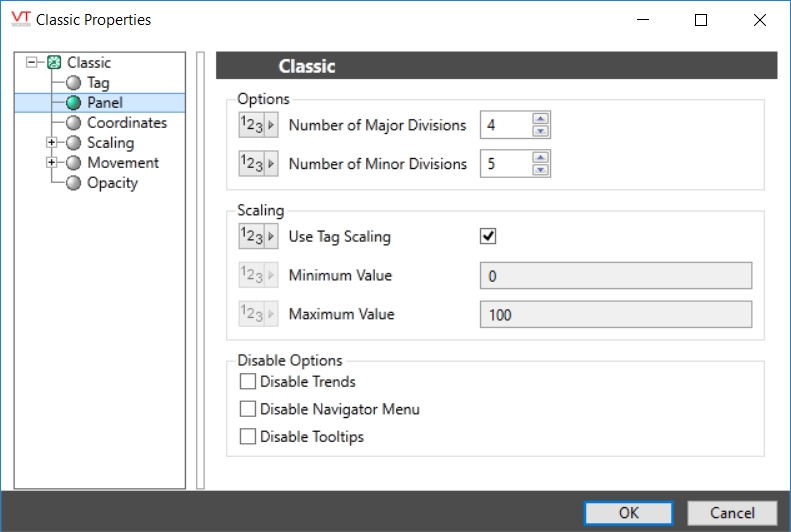You can override those values to set your own scale range. For example, assume that you have a tag for which the minimum and maximum scaled process values are 20 and 80 respectively. Drawing this tag with a minimum value of 0 and a maximum value of 100 will result in a meter that shows a full range of numbers from 0 to 100, but whose needle will move only between 20 and 80.